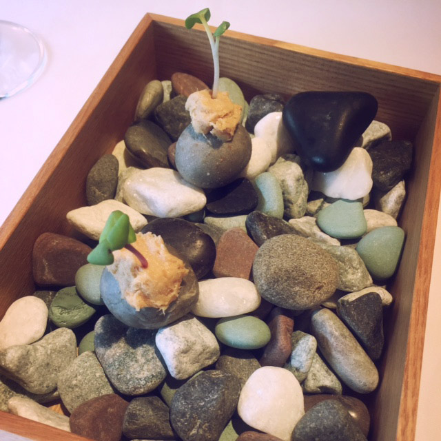 木箱に敷き詰められた小石から芽がピョコン。